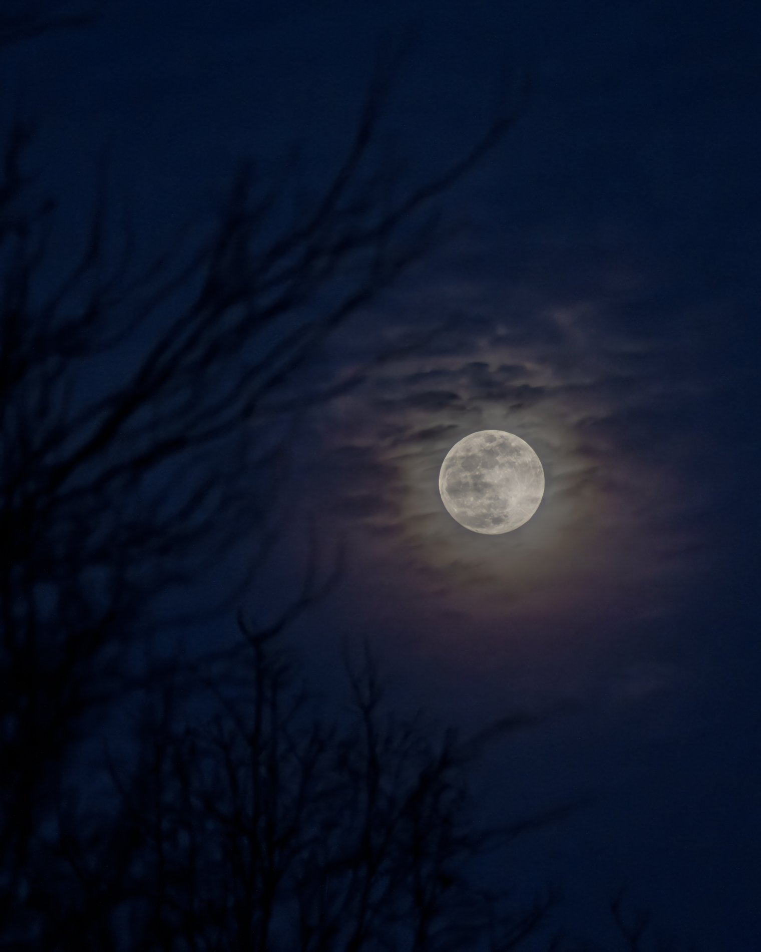 A full moon shines through a veil of thin clouds, surrounded by a deep blue night sky and faint tree silhouettes.